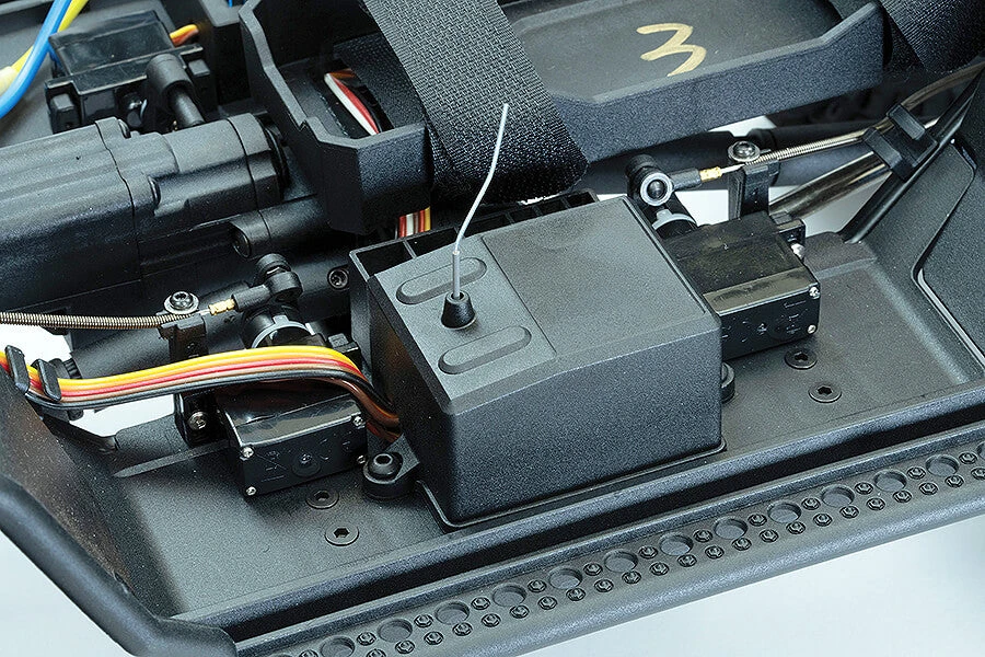 An authentic looking transmission casing, with engine cover over hiding the 25kg metal gear rated steering servo and 20-turn brushed 550 motor as some scale realism, along with moulded inner fenders, rubber mud flaps and side plates.