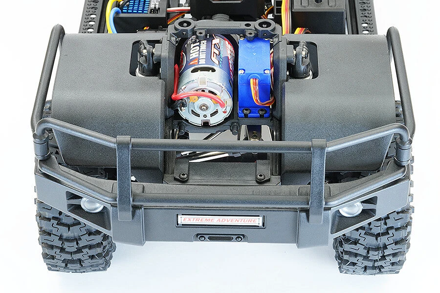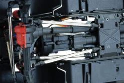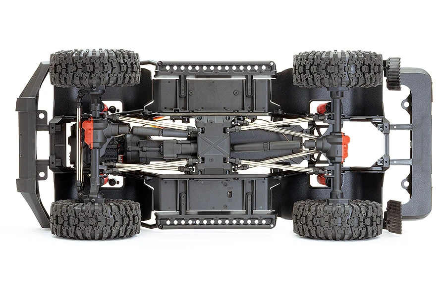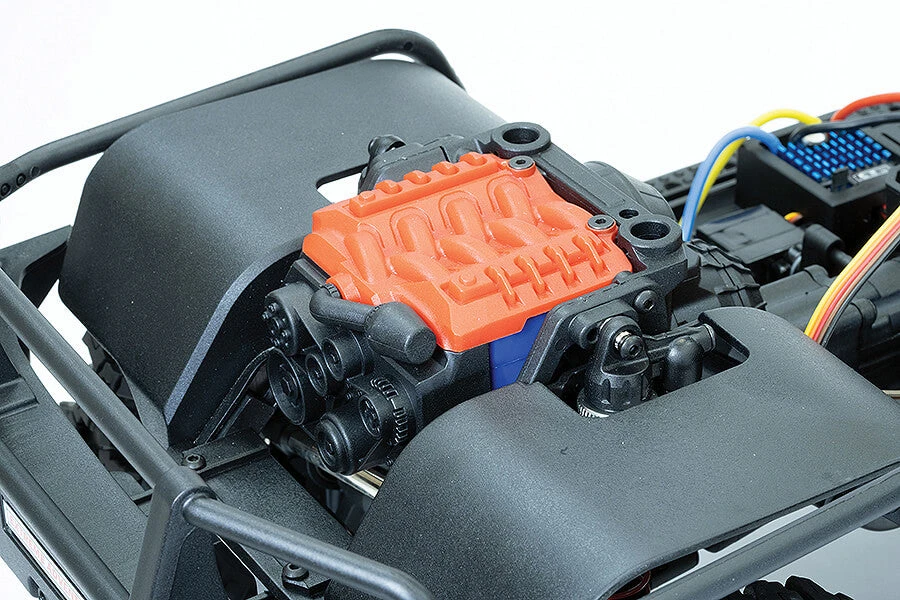 This workhorse has it all and can pull through the most demanding of terrain and surfaces. With a switch-able, servo operated 2-stage trans-mission, high and low speeds are easily set for whenever the need pre-sents itself. Front and rear differentials help with more drivability, but what if you are stuck in a rut or snagged on rocks? No problem, just switch via the transmitter and have on board servos lock the rear or front diff axles, or both to help get the drive and traction you need to navigate your way out of trouble.