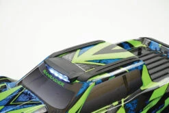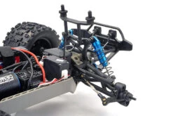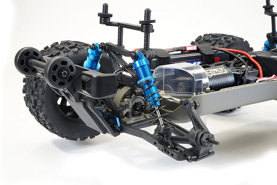 Oil filled aluminium shock absorbers along with a raised high clearance main chassis, with aluminium front and rear skid plates glide over most terrain effortlessly. Should you take a tumble, shock absorbing bumpers and moulded body roof and tail skid bar rails help protect from heavy damage when possible.