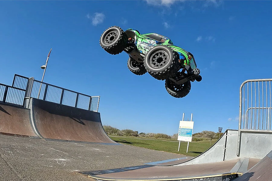 Powered by a Hobbywing 50A brushless speed control and 2500kv motor, coupled with the included Voltz 3S 3500mAh Lipo battery the RamRaider can reach impressive top speeds for its size, while still being very drivable on most surfaces. The rear mounted wheelie bar works to provide a sta-ble footing for those heavy accelerations when you light up the rear tyres.