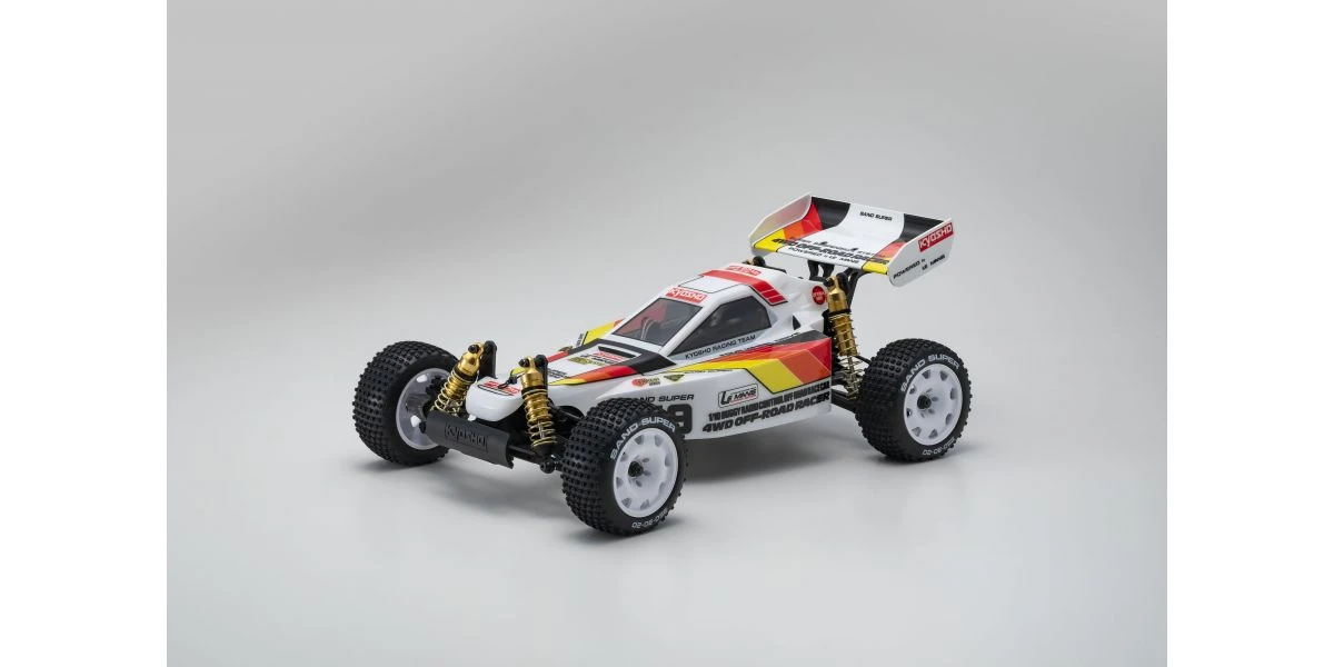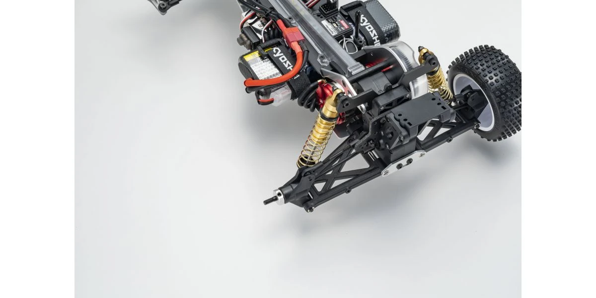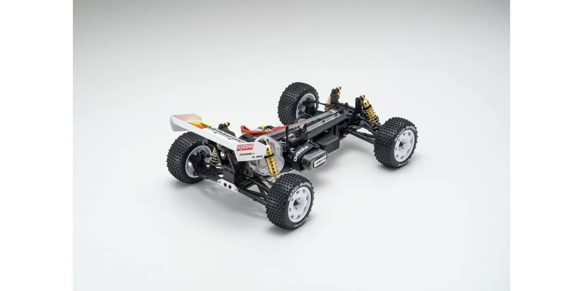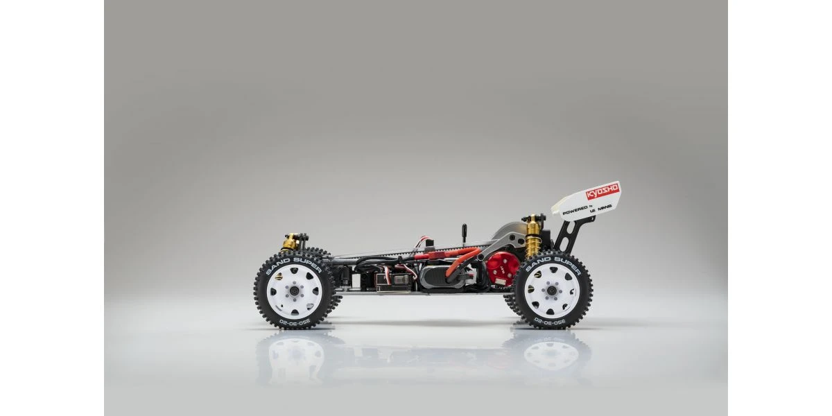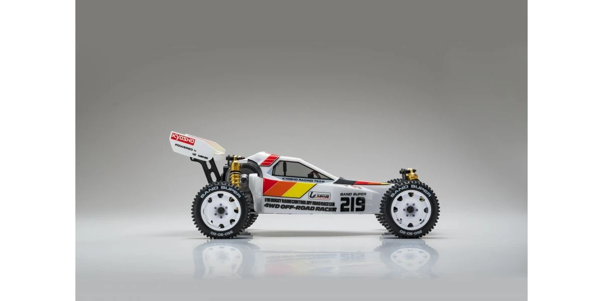 The Optima Mid is remembered for its brilliant debut at the 2nd World Electric Off-Road Car Championships in England 1987, where the prototype occupied 5 out of the 10 qualifiers in the A-Main final and finished in second place. Optima’s chassis layout with midship motor position and undercarriage grew in popularity and became the foundation for modern racing buggies. It is this Optima Mid that will be reproduced as the 10th model in the Kyosho vintage series. The main chassis is made from 6016T6 aluminum alloy that guarantees high rigidity. Each component of the car has been updated to match a modern power system, such as the 48-pitch gear for improved efficiency and precision gear ratio setting. The recreated Optima Mid also features adjustable belt tension using a tensioner not available at the time, ultimately achieving a smooth drive with minimal loss. Furthermore, equipment from the Turbo Optima Mid such as the FRP front and rear shock stays, and countersunk main chassis have also been incorporated into this model. The racy form of the original Optima Mid body design is faithfully reproduced in line with the popular vintage series. Experience the driving spirit of the Optima Mid incorporating the state-of-the-art mechanics from the past that cannot be matched by anything today.