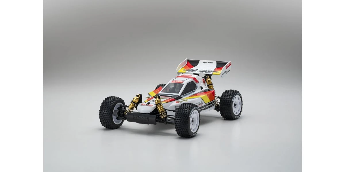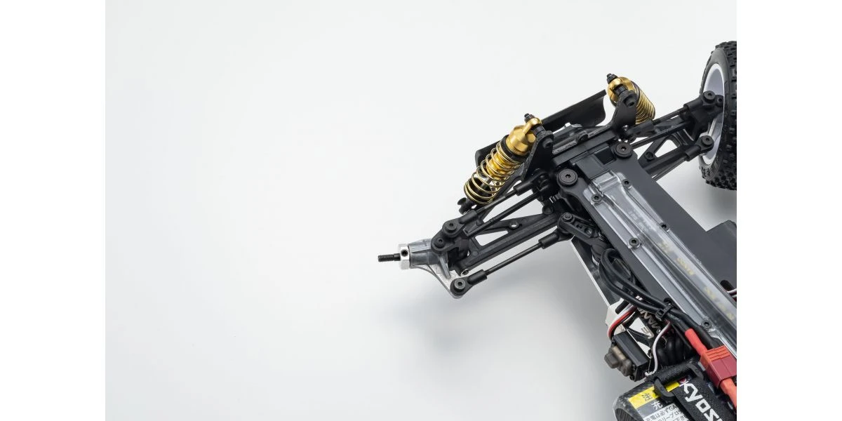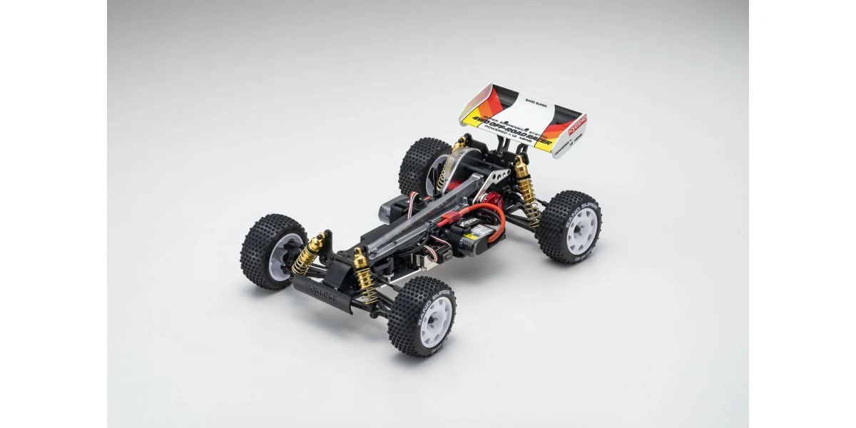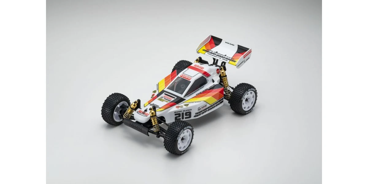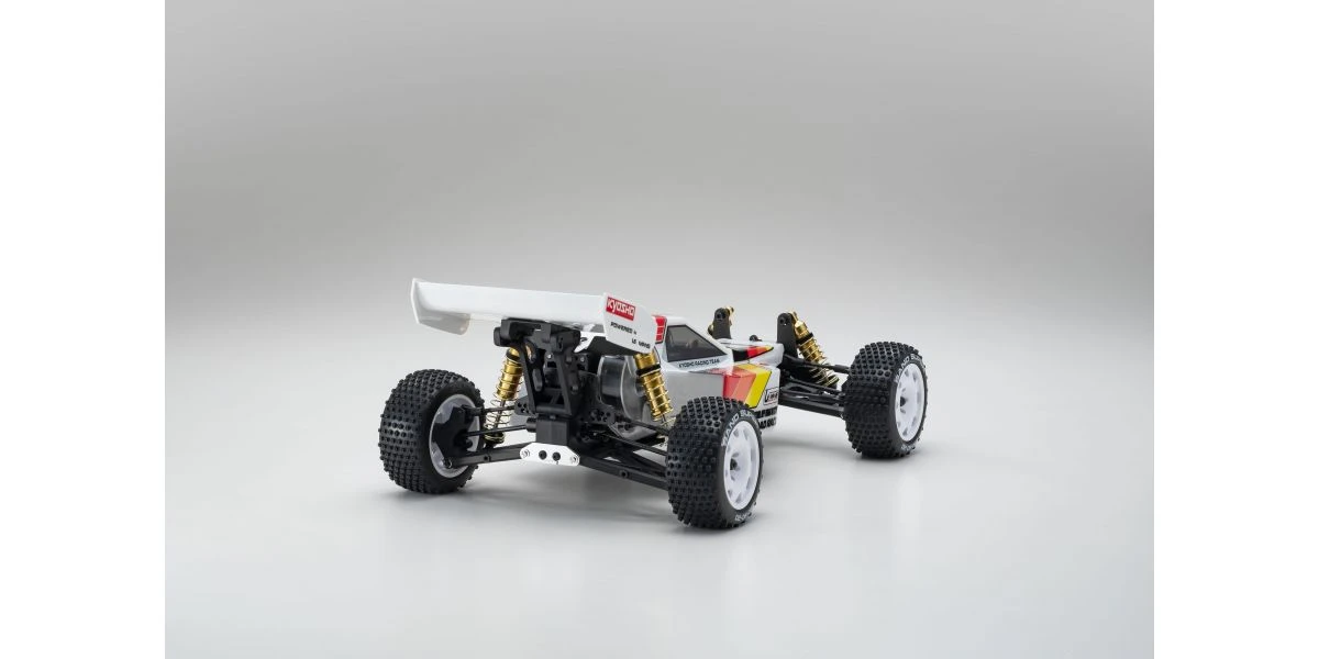 The Optima Mid is remembered for its brilliant debut at the 2nd World Electric Off-Road Car Championships in England 1987, where the prototype occupied 5 out of the 10 qualifiers in the A-Main final and finished in second place. Optima’s chassis layout with midship motor position and undercarriage grew in popularity and became the foundation for modern racing buggies. It is this Optima Mid that will be reproduced as the 10th model in the Kyosho vintage series. The main chassis is made from 6016T6 aluminum alloy that guarantees high rigidity. Each component of the car has been updated to match a modern power system, such as the 48-pitch gear for improved efficiency and precision gear ratio setting. The recreated Optima Mid also features adjustable belt tension using a tensioner not available at the time, ultimately achieving a smooth drive with minimal loss. Furthermore, equipment from the Turbo Optima Mid such as the FRP front and rear shock stays, and countersunk main chassis have also been incorporated into this model. The racy form of the original Optima Mid body design is faithfully reproduced in line with the popular vintage series. Experience the driving spirit of the Optima Mid incorporating the state-of-the-art mechanics from the past that cannot be matched by anything today.