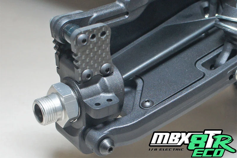 New “C” and “D” suspension mounts now use square pills for increased tuning of toe-in and anti-squat, and geometry. The front and rear arms use an impact resistant material for increased durability. Stiffer LW front and rear arms will be available as option parts for the MBX8TR Eco. The rear uprights are also new for the MBX8TR Eco. The molded uprights have CFRP plates to adjust the rear roll center.