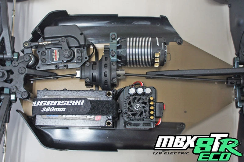 The MBX8TR Eco chassis features a slightly new design. New battery mount for 4S shorty and standard batteries. You can install either short or standard size batteries using the new two-piece battery tray. The kit comes with 1 strap for 4S short battery (380mm) and 1 strap for 4S standard battery (455mm).