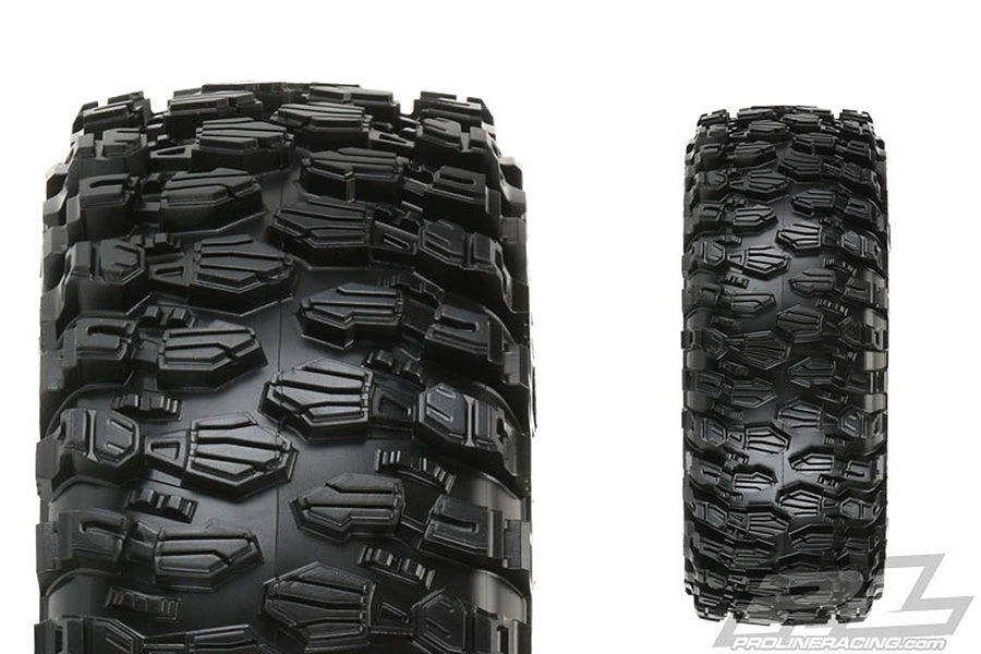 This is a pair of Hyrax 2.2″ Tires. The future of 2.2″ Rock Racing Tire Performance has arrived with Pro-Line’s all-new Hyrax Tire! Designed from the ground up for maximum grip on the toughest terrain, the Hyrax tire is ready for anything the Race might throw at you. The Hyrax features an aggressive and open tread pattern with each tread block containing multiple Sipes for incredible tread flex. The highly detailed connected tread on the sidewall of the Hyrax extends out for unmatched side-hilling performance. The Hyrax also features futuristic stepped tread blocks that create even more forward gripping edges that dig into slick rock like no other scale tire Pro-Line has produced to date! The Hyrax is made from Pro-Line’s Legendary G8 material, so you know it provides performance you can depend on.